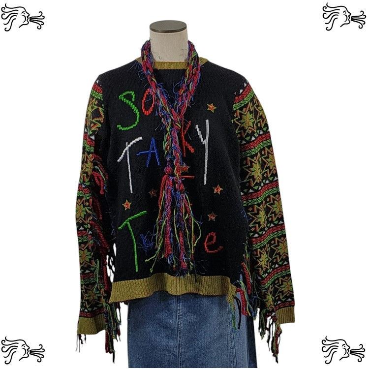 Upcycled Christmas Tacky Sweater Poncho Handknotted Fringe Crochet